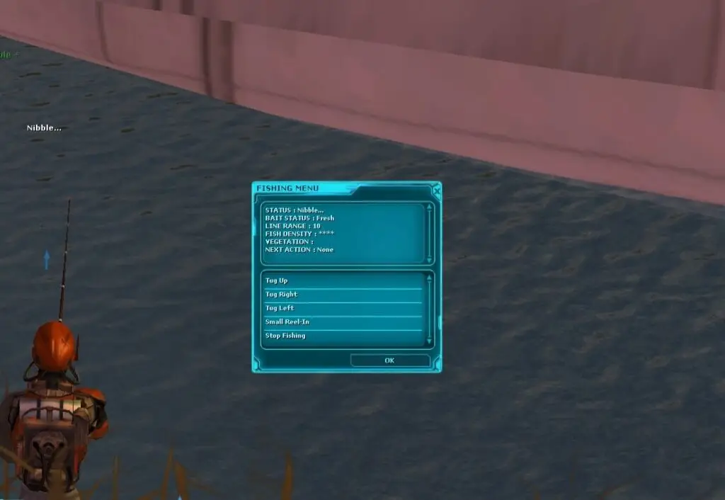 How to fish: Every 5 seconds, the window has a status update (Waiting, Snagged, Nibble, and Bite). A small reel in seems to provoke a nibble during waiting, and provoke a bite during a nibble. Once you have a bite, select any tug option press okay. Tug up seems to work best for me.